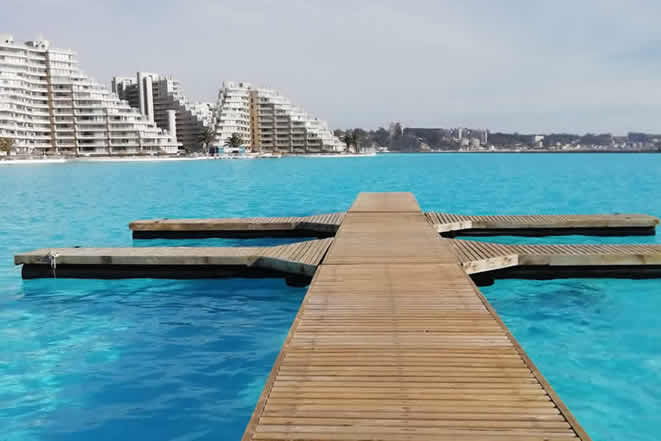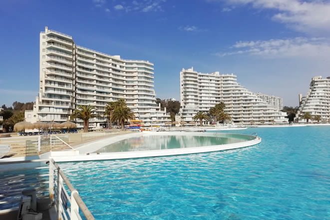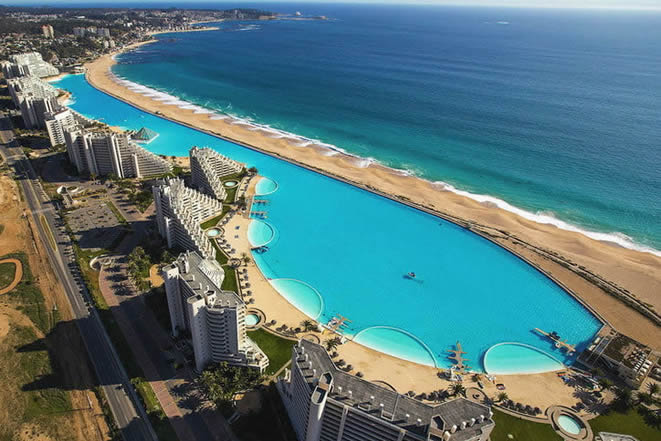 Una de las piscinas mas grandes del mundo donde se puede navegar por ella. Se encuentra en San Alfonso del Mar en Algarrobo (Chile) y abrió sus puertas en 2006. Aproximadamente con el tamaño de 6,000 piscinas, una superficie oficialmente medida en casi 80,937 metros cuadrados y 66 millones de galones de agua, la piscina de San Alfonso del Mar está llena de agua salada y está constantemente regulada, por lo que siempre más cálida que el frío Océano Pacífico.